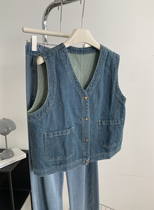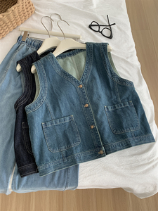 2025秋季叠穿复古小金扣牛仔马甲女V领背心水洗蓝明线无袖坎肩