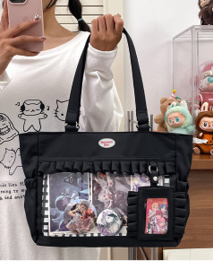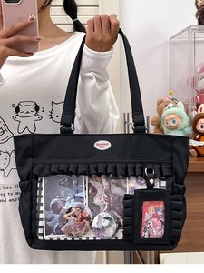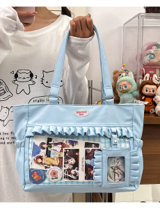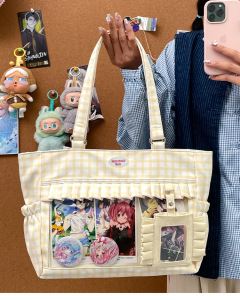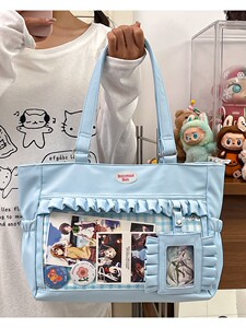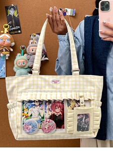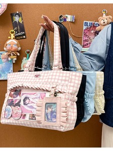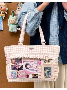 可爱格子荷叶边手提包森系小清新大容量单肩包二次元吧唧痛包娃包
