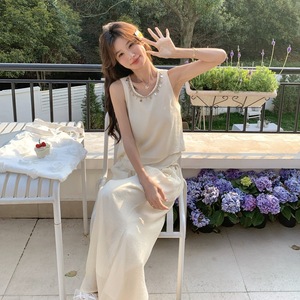 米白色休闲无袖上衣套装女2025年夏季新款气质高级感阔腿裤两件套