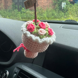 手捧花钩织创意成品钥匙扣小玫瑰车汽车车内饰品车挂礼物花束仿真