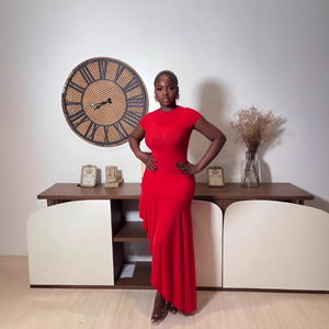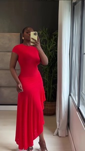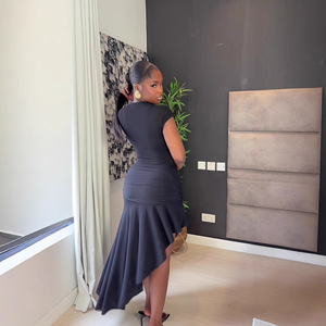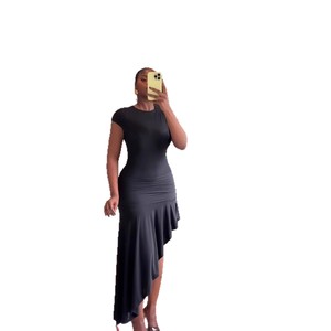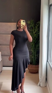 欧美跨境女装2025早秋新款纯色圆领短袖修身不规则气质长款连衣裙