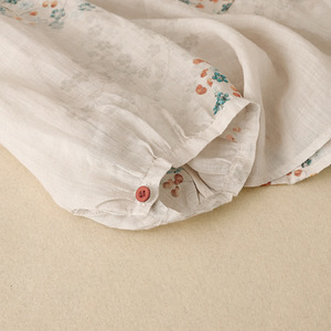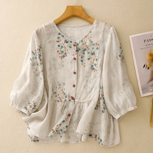 夏季随机印花棉麻花边圆领小衫女 复古文艺气质衬衣宽松花色衬衫