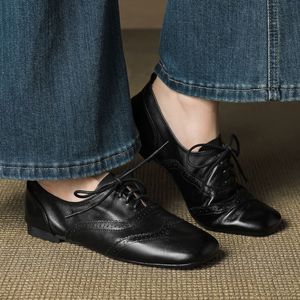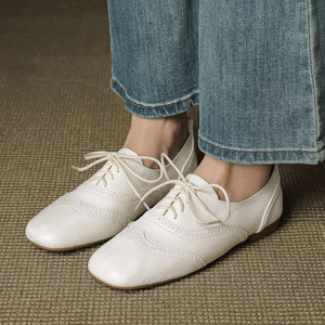 超软360°弯折雕花布洛克系带小皮鞋2025秋平底圆头真皮深口单鞋