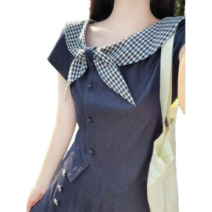 法式复古娃娃领套装夏季新款短袖格子上衣拼接半身裙两件套纯色
