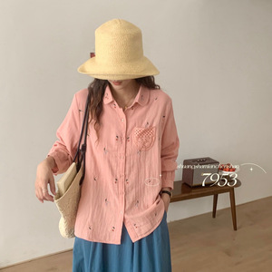 双纱刺绣衬衫女 2025秋新款森系文艺宽松翻领单排扣衬衣 7953