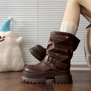 棕色靴子女短靴2025年新款复古帅气小个子粗跟炸街休闲机车裤管靴