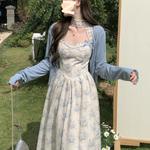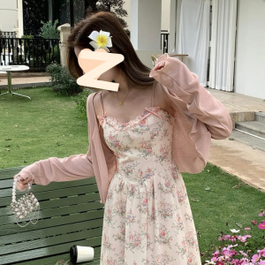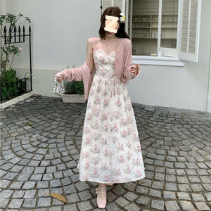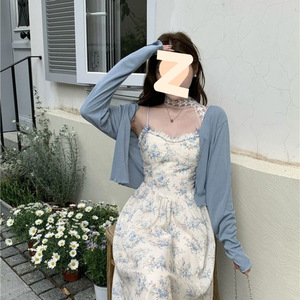 大码女装微胖法式复古风印花吊带裙高腰显瘦长裙开衫两件套套装