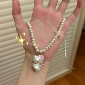 可爱粉色系带蝴蝶结KT猫仿珍珠项链童趣趣味长款装配品配饰锁骨链