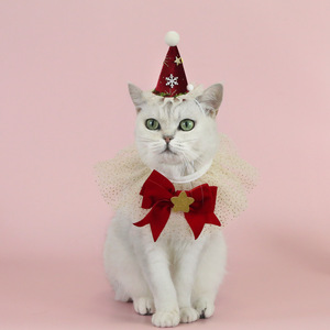 2025宠物金色花边丝绒蝴蝶结围脖公主圣诞帽子猫咪小狗狗配饰套装