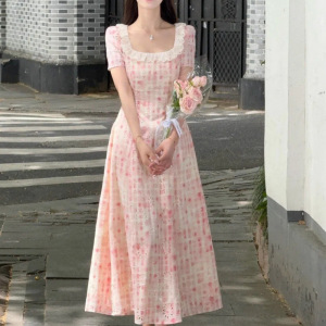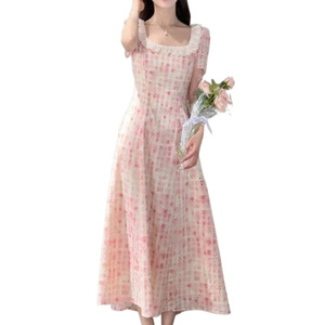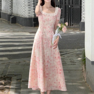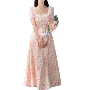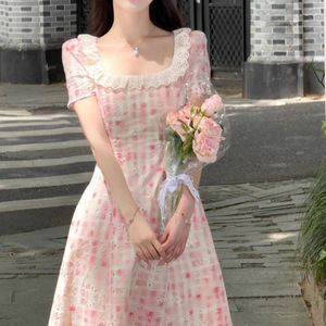 法式方领碎花连衣裙女2025夏季新款温柔设计感优雅收腰显瘦长裙子