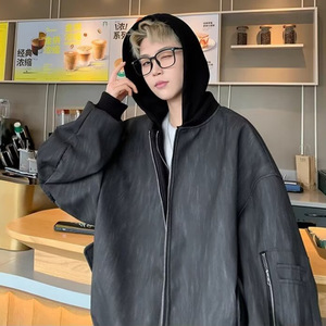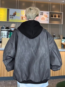 美式假两件外套男春秋季潮牌PU皮百搭纹理夹克复古高街痞帅上衣
