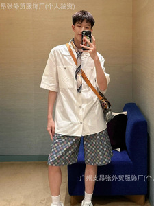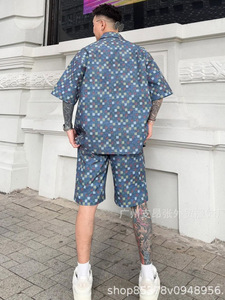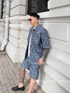 驴家新款彩格马赛克半袖牛仔衬衣套装短裤棋盘格拼接牛仔男女同款