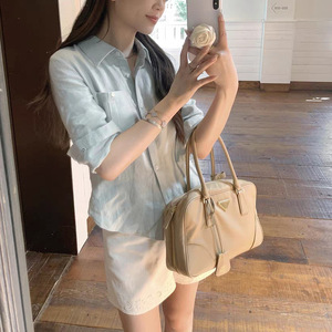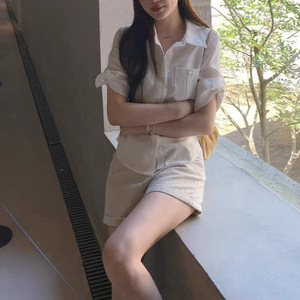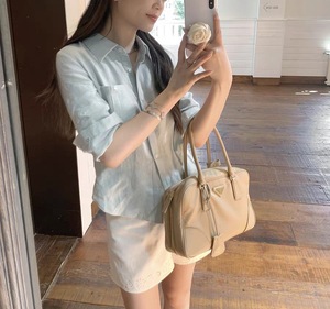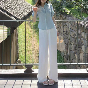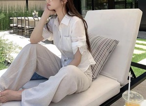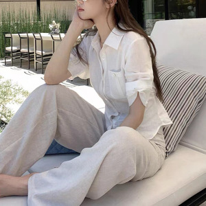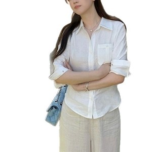 AHY 1朝雾蓝100亚麻通勤简约经典正肩收腰可系带五分袖白衬衫女