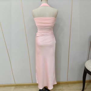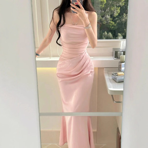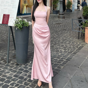 TZ8046法式网纱拼接粉色挂脖连衣裙女夏设计感收腰显瘦包臀长裙子