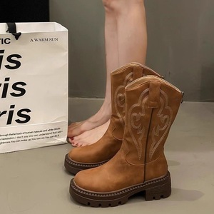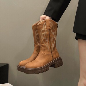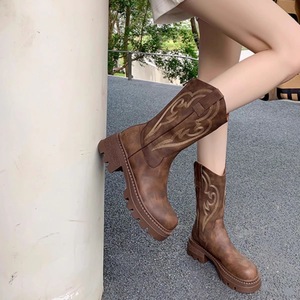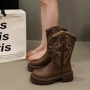 棕色美拉德粗跟厚底马丁靴女款2025新款夏季西部牛仔增高中筒靴子