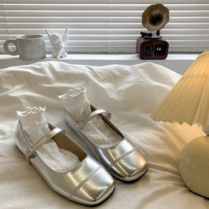 女童方头浅口百搭平底银色玛丽珍鞋2025新款夏季法式配裙子小皮鞋