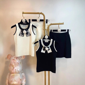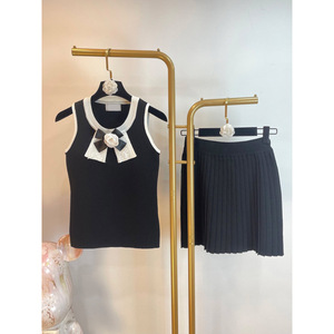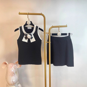 25年早秋新款香家立体花朵logo撞色针织无袖背心+半裙两件套装裙