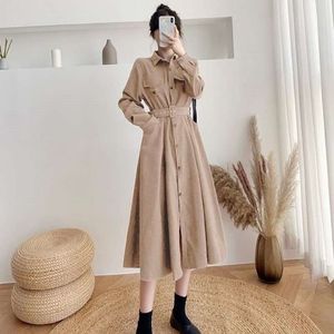 法式收腰灯芯绒连衣裙女秋冬韩版中长款单排扣长袖打底过膝衬衫裙