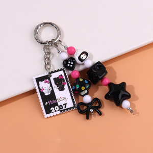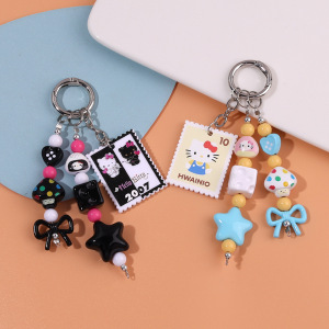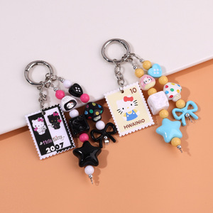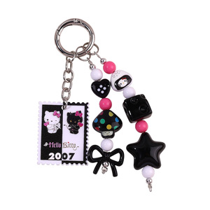 蝴蝶结小猫钥匙扣可爱卡通串珠邮戳挂件ins风黑白彩色款包包挂饰