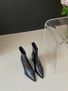 高跟尖头短靴2025年秋冬季新款欧美粗跟裸靴瘦瘦靴复古棕色马丁靴