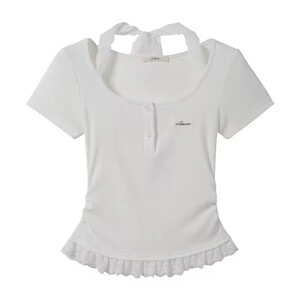 纯欲甜辣假两件拼接挂脖短袖T恤新款蕾丝抽褶收腰修身打底上衣女