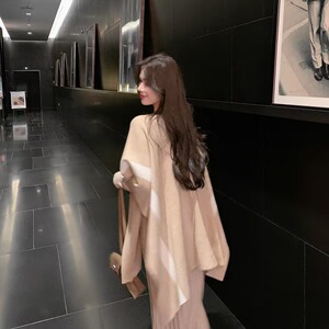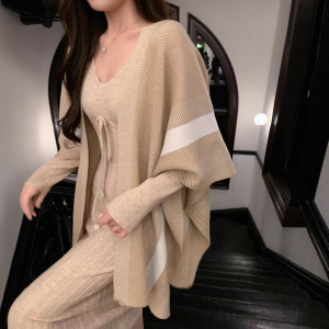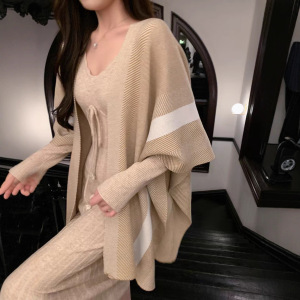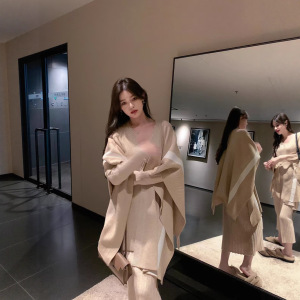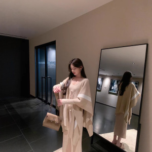 ByYou新款十字纹棕色针织开衫中长款披肩斗篷毛衣针织裙两件套装