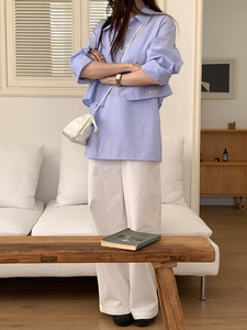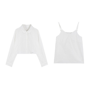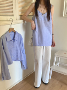 缪系蓝色条纹衬衫女秋季2025新款韩版设计感吊带背心衬衣两件套
