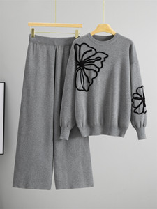 跨境时尚气质小香风针织套装女秋冬长袖花朵毛衣休闲阔腿裤两件套