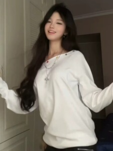 美式慵懒风设计白色斜肩彩色扣子宽松长袖t恤女秋季小众露肩上衣