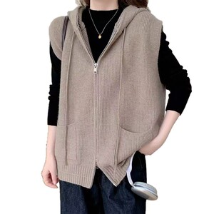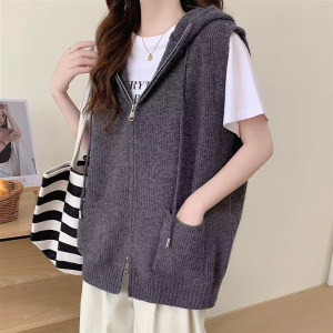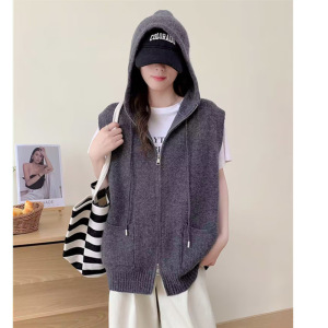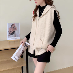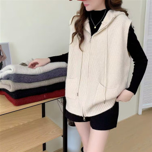抽绳无袖连帽拉链口袋针织马甲女开衫秋冬新款宽松叠穿毛衣背心女