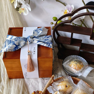 中秋双层8粒木盒空盒+蓝色印花包布+中秋佳节封条+小珠流苏一个约20*20*13.8cm