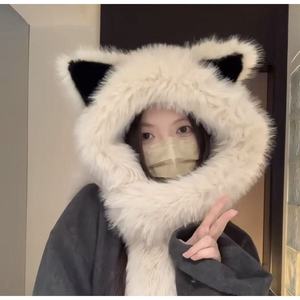加厚防寒毛绒狐狸耳朵帽女冬季围巾一体新款保暖百搭显脸小雷锋帽