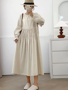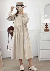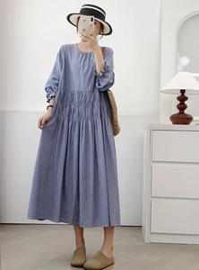 日系森系竖条纹棉麻连衣裙秋季新款甜美减龄百搭褶皱拼接中长裙子