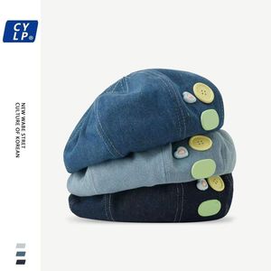 日系秋季新款纽扣水洗牛仔贝雷帽子女大头围显脸小八角帽小画家帽