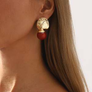 E14017 ZA新款个性几何不规则捶打纹耳环气质时尚红色珠子耳钉女