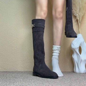 牛皮版~复古皮带锁扣不过膝骑士靴女方头磨砂拉链显瘦长靴子