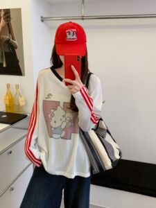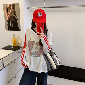 AE韩版复古V领长袖猫咪数字球衣穿搭运动风印花长袖T恤628