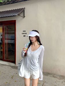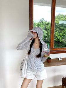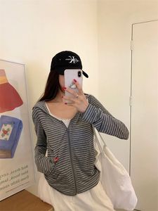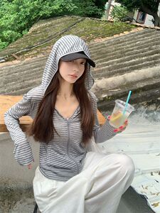 慵懒风条纹拉链长袖连帽开衫外套女夏季短款百搭休闲防晒罩衫上衣