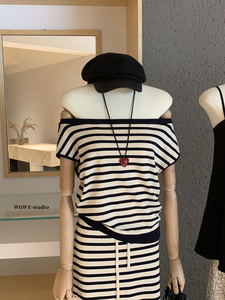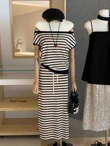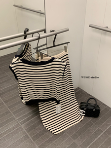 WGWE时尚法式条纹一字肩针织T恤女+高腰直筒半身裙两件套装W6762