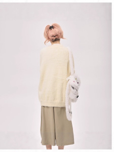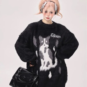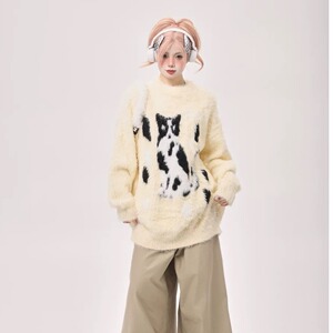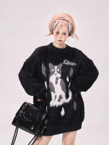 美式复古猫咪提花毛衣女春秋季跨境潮牌宽松休闲慵懒风套头针织衫