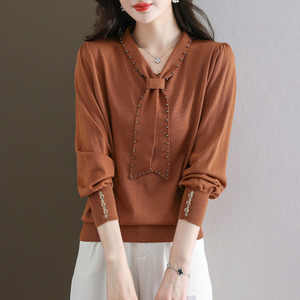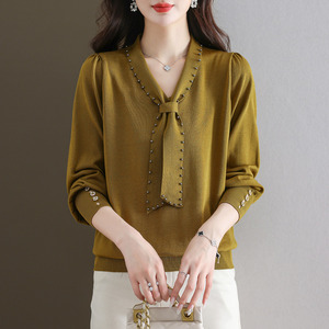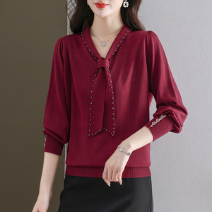 设计感钉珠蝴蝶结秋新款女装毛衣长袖针织衫女宽松显瘦打底衫上衣