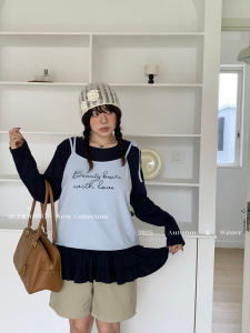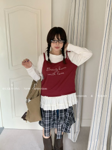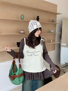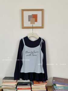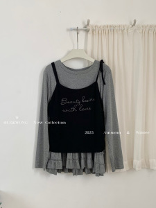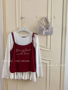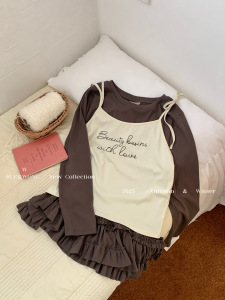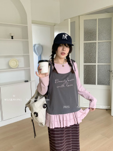W家洋气多巴胺秋季新款字母刺绣吊带背心长袖荷叶边t恤上衣套装女