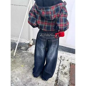 新款设计感刺绣拼接欧美做旧水洗垂坠感牛仔裤女直筒宽松弯刀长裤