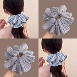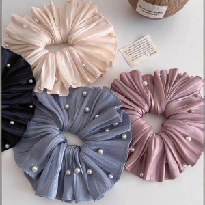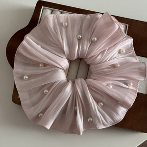 高级感流光缎面珍珠大肠发圈2025新款扎马尾温柔蓬松褶皱头花发饰