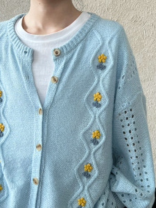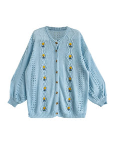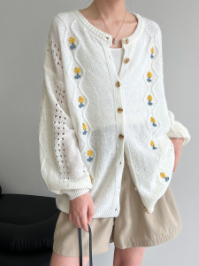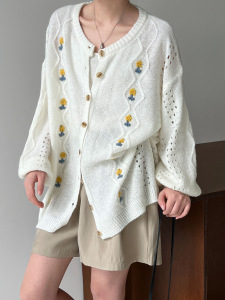 鹿西 温柔风花朵镂空钩花羊毛针织开衫女2025秋宽松长袖毛衣ss762