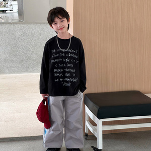 顽兔2025男童秋季新款韩版字母印花大童T恤竹节棉圆领儿童打底衫