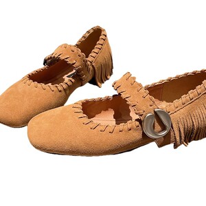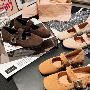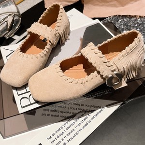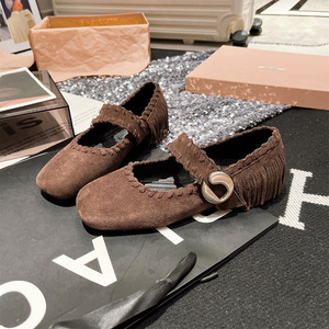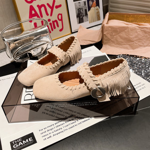 2025春秋流苏一字扣带真皮浅口单鞋女平底芭蕾舞鞋玛丽珍鞋耐磨