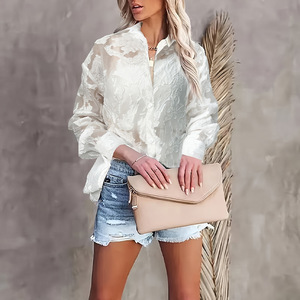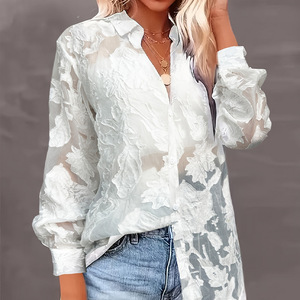 女衬衫跨境网纱透袖白色气质通勤优雅舒适沙滩衣时尚纽扣提花薄纱