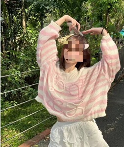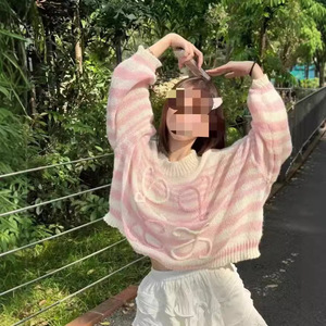 欧美外贸灯笼袖彩虹条纹撞色毛衣女甜美百搭宽松套头针织衫薄款女
