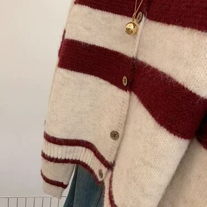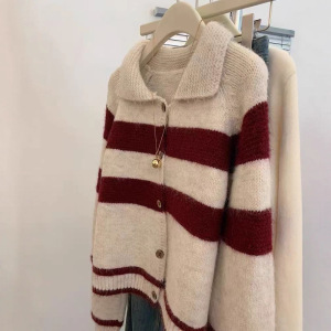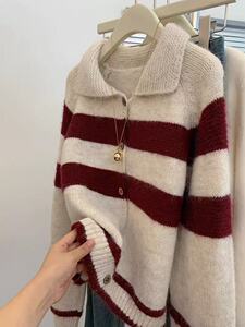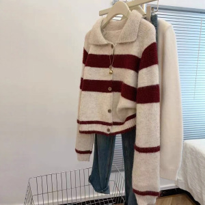 韩系条纹翻领针织开衫毛衣女加厚秋冬内搭可外穿打底衫高级感上衣